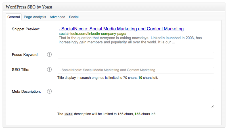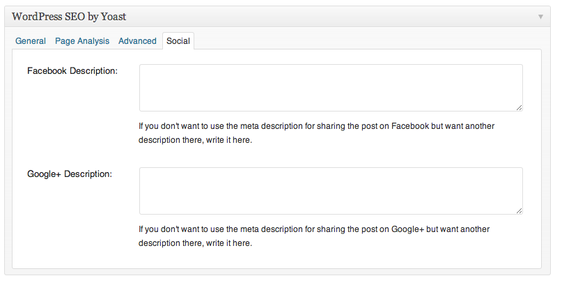 If you want a different Meta Description to appear on Facebook or Google+ you can click the Social Tab and fill it out accordingly.