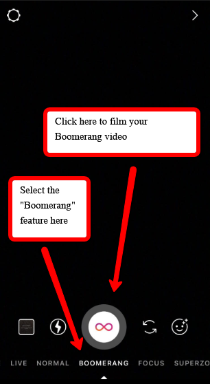 The “Boomerang” feature, found just to the right of the “Normal” option at the bottom of the story camera screen, is a very popular and fun option for your Instagram story. A Boomerang is a short video that plays forward and then backwards, with no sound. Many users use this feature to create silly or clever eye-catching stories! To create a Boomerang, you simply select “Boomerang” at the bottom, and click the circle, which will now have an infinity symbol inside it.