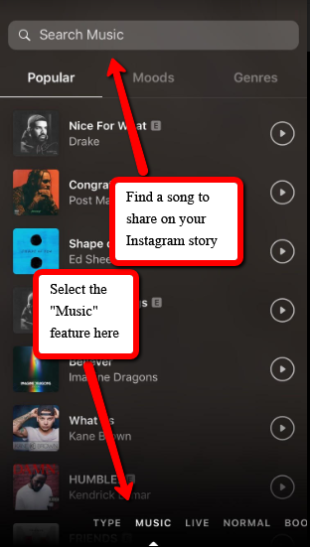 You can search and select on a song from Spotify, and then select a section of the song to be played in the background of your photo or video. The story will then credit the song by displaying the artist and