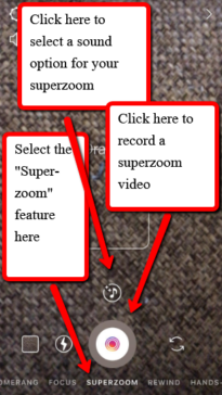 The “Superzoom” feature, found to the right of the “Focus” feature, has a few options for short videos which zoom in automatically onto the subject. There are different options for sounds and color to accompany the video. You can select different options by clicking the encircled music-note icon.